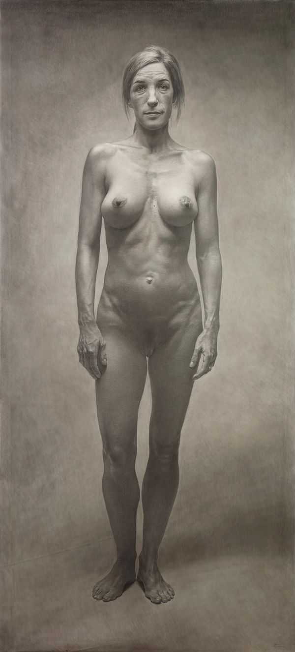 One of the central pieces of this exploration is a life-size drawing of a female nude, executed with graphite on a polyester canvas.