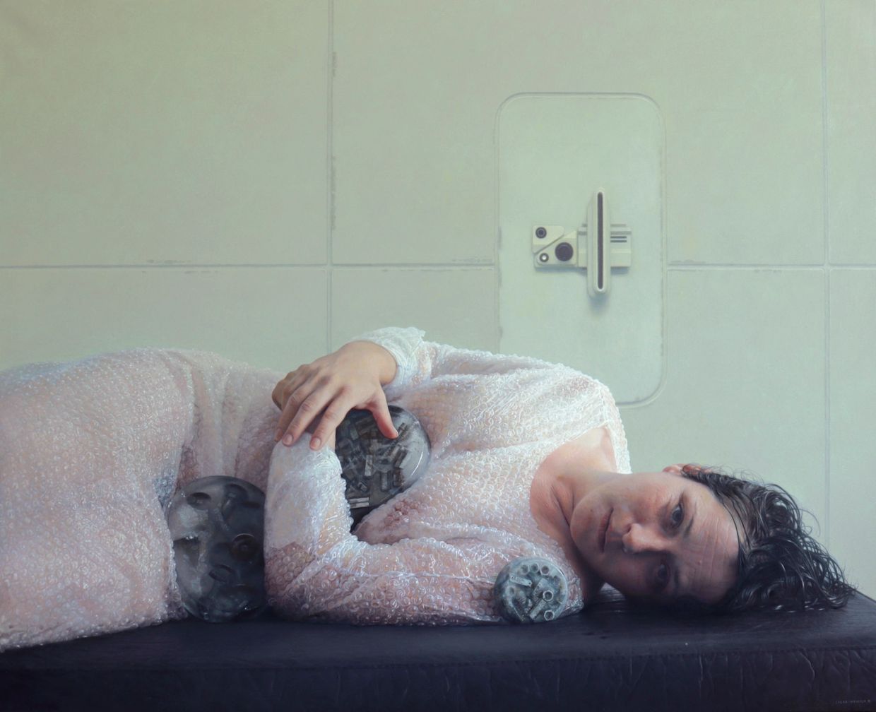 The metaphor includes a series of symbols: The origins of Nobody go back to four previous paintings linked together whose kinship shows ideas expressed by women wrapped in bubble wrap. Ice and other materials are included as similar substitutes for female models. The creation of these alternatives also served to convey the necessary transparencies that induce the viewer to look inward.